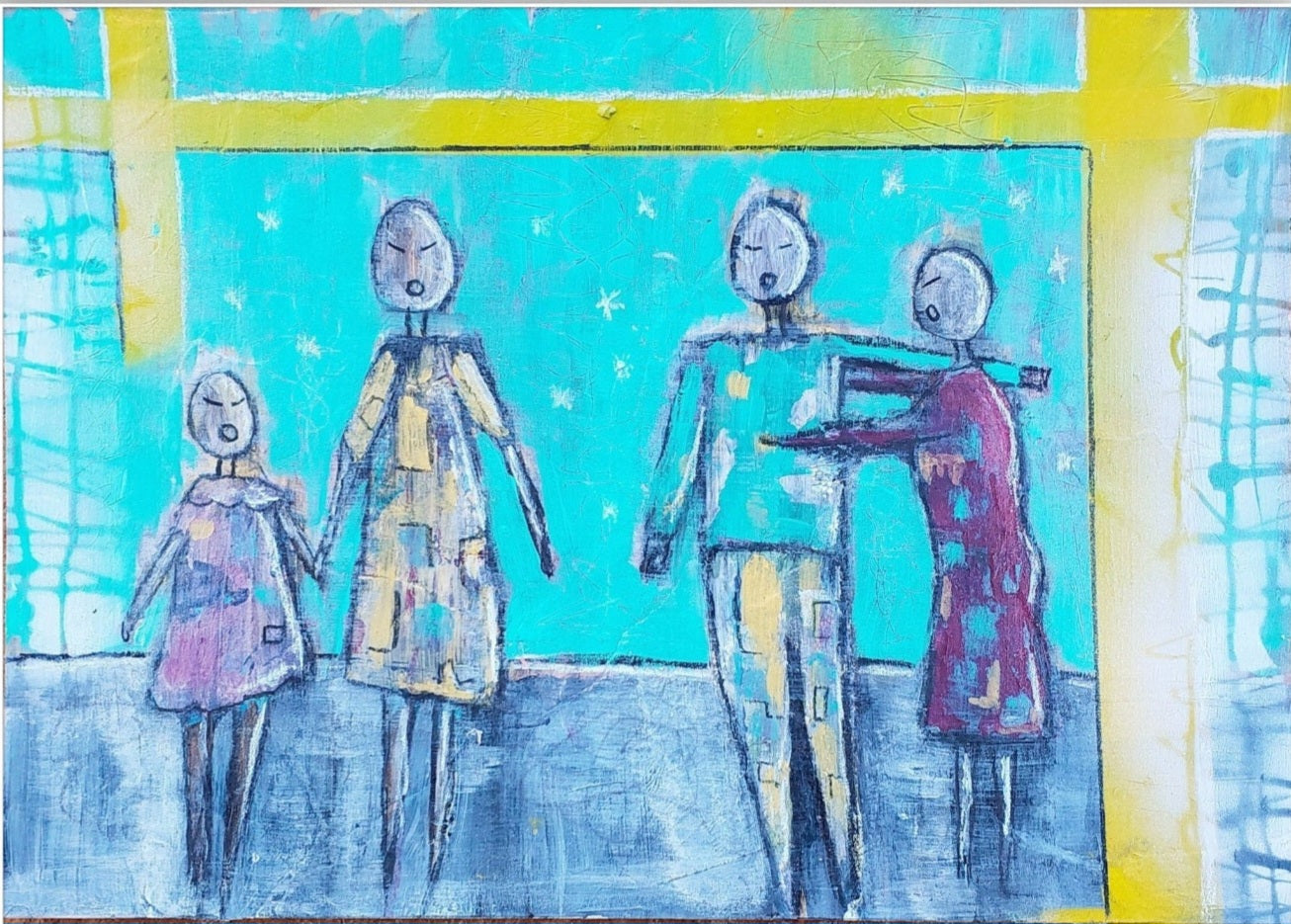 This artwork explores connection and distance—figures share the same space, yet remain emotionally apart. Some reach out, others stand still, reflecting the unseen forces that shape relationships. Soft colors and layered textures create a quiet, introspective atmosphere, inviting personal reflection on the spaces between people.